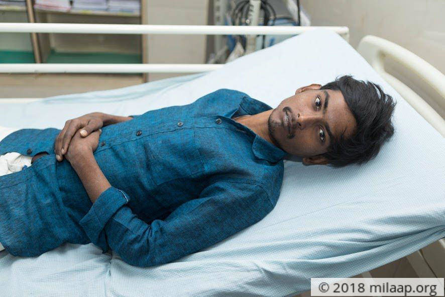 “He’s always in pain and sometimes he throws up blood, but there’s nothing we can do to ease my brother’s suffering.”In 2013, Srikar’s and his family’s life changed for the worse. One morning he started vomiting blood and it alarmed his mother Jayamma and his younger brother Srihari. They immediately took him to a hospital in Kurnool where he was diagnosed with a failing liver. To aid him in recovery, they bandaged his damaged liver through endoscopy and gave him the necessary treatment. But 4 months later, his illness came back worse than before. He started vomiting blood again. Now his condition is so serious, that only a liver transplant can save him.Srikar’s aspirations came to an abrupt stop, with his diagnosisSrikar, now 24 years old, has been suffering from Decompensated Liver Disease since 5 years. Throughout this time, he has been having frequent episodes of blood vomiting, fever, and swelling in legs and the stomach. At an age where everyone else focuses on c
