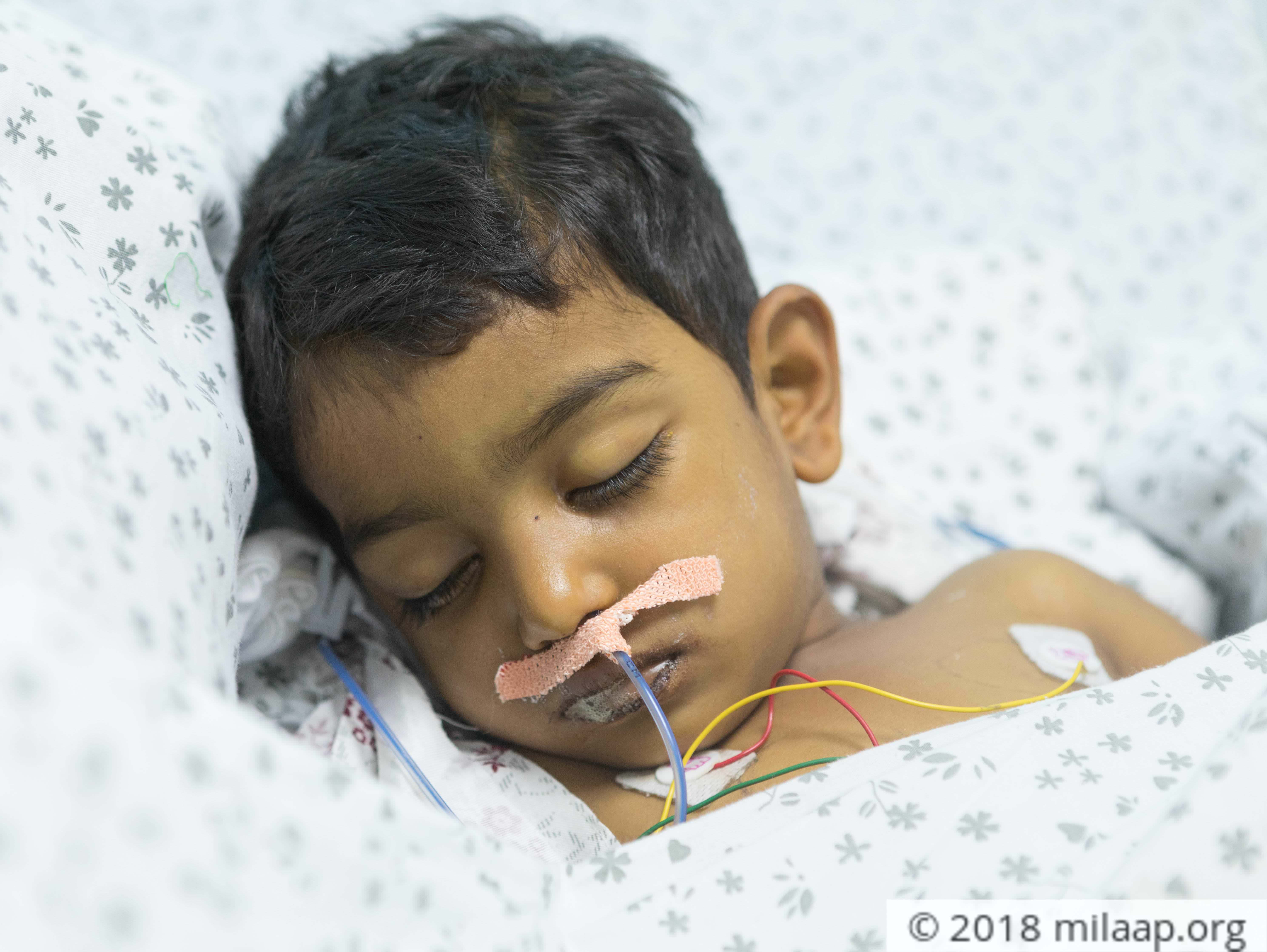“In the next 24 hours, if he doesn’t get the transplant, he will go into a coma and die. He hasn’t spoken a word or opened his eyes since the past 3 days.” – Feroz Khan, Toukir’s father, while weeping uncontrollably.Feroz and his wife, Tahseen by Toukir's side, who is unconscious After suffering severely from jaundice, 3-year-old Toukir Khan’s liver has completely failed. He is extremely critical and has only 24 hours to live unless he undergoes a liver transplant immediately. His father has been matched to be a suitable donor but he has absolutely nothing left to provide for the surgery. Now, he is running out of time to save his dying son.Toukir is extremely criticalToukir was completely normal until last month. Suddenly, the 3-year-old became extremely weak and was suffering from jaundice. His skin turned yellow very quickly.Toukir, when he was normal and healthyResiding in rural Maharashtra, Feroz and his wife, Tahseen, rushed their 3-year-old baby to a local hospit